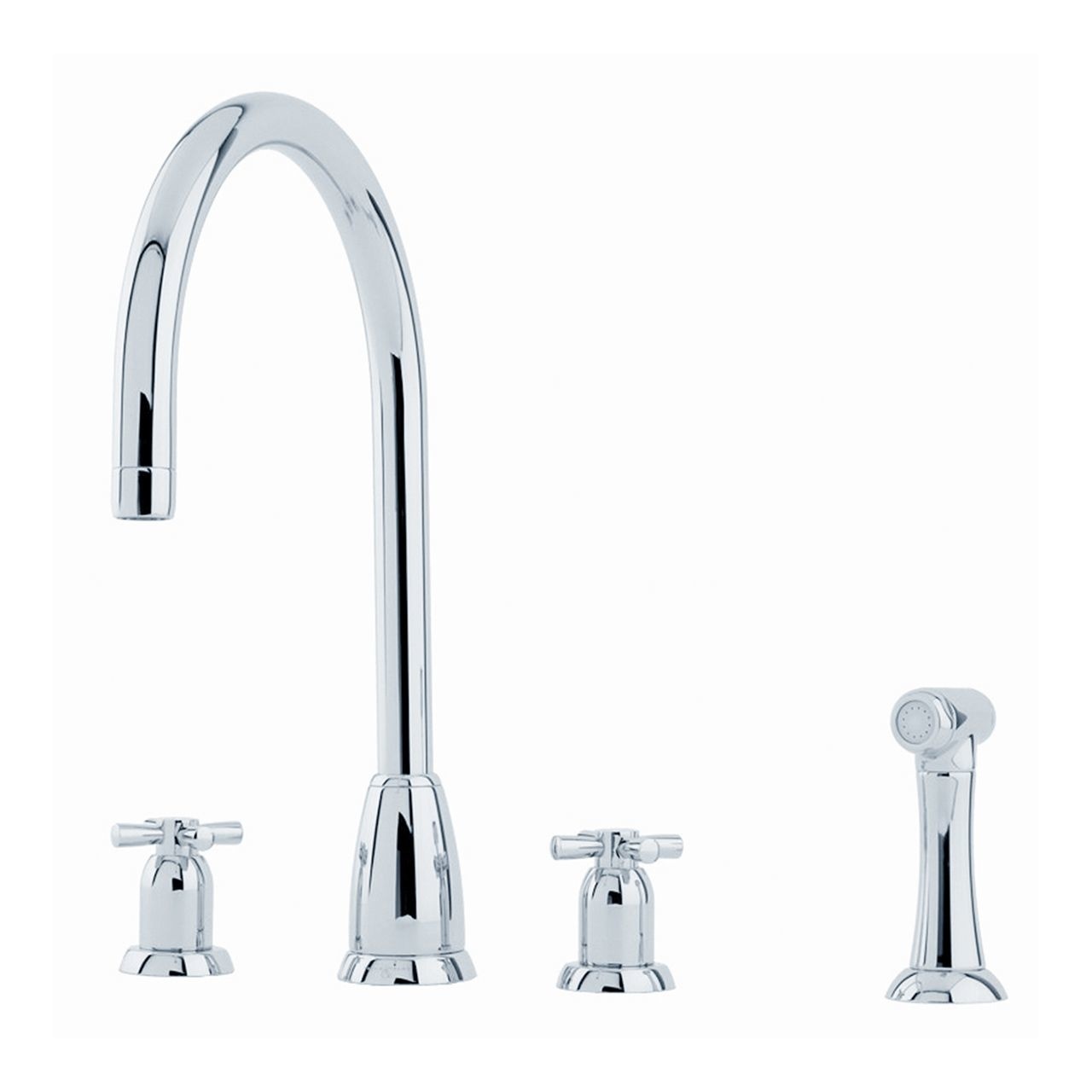 4-hole kitchen sink mixer with crosshead handles, C-spout, rinse, swivel spout and aerator.