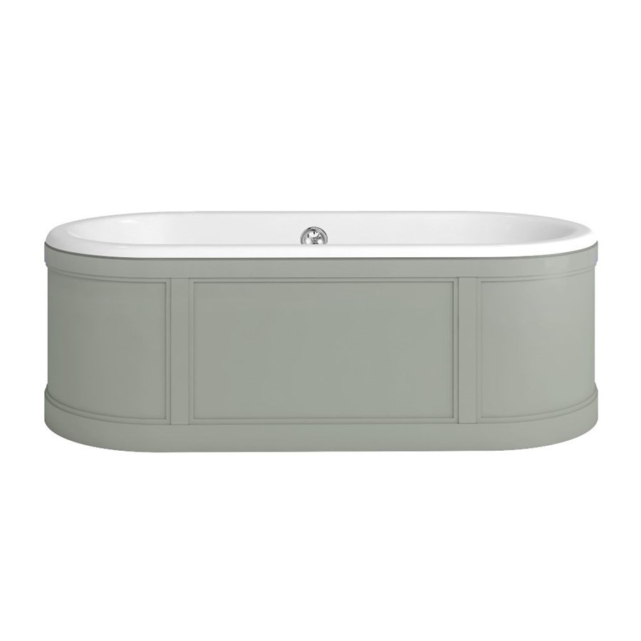 London acrylic bath with curved surround in finish matt white, dark olive, sand or grey; inner bath lucite whithout Cleargreen finish; surround PVC