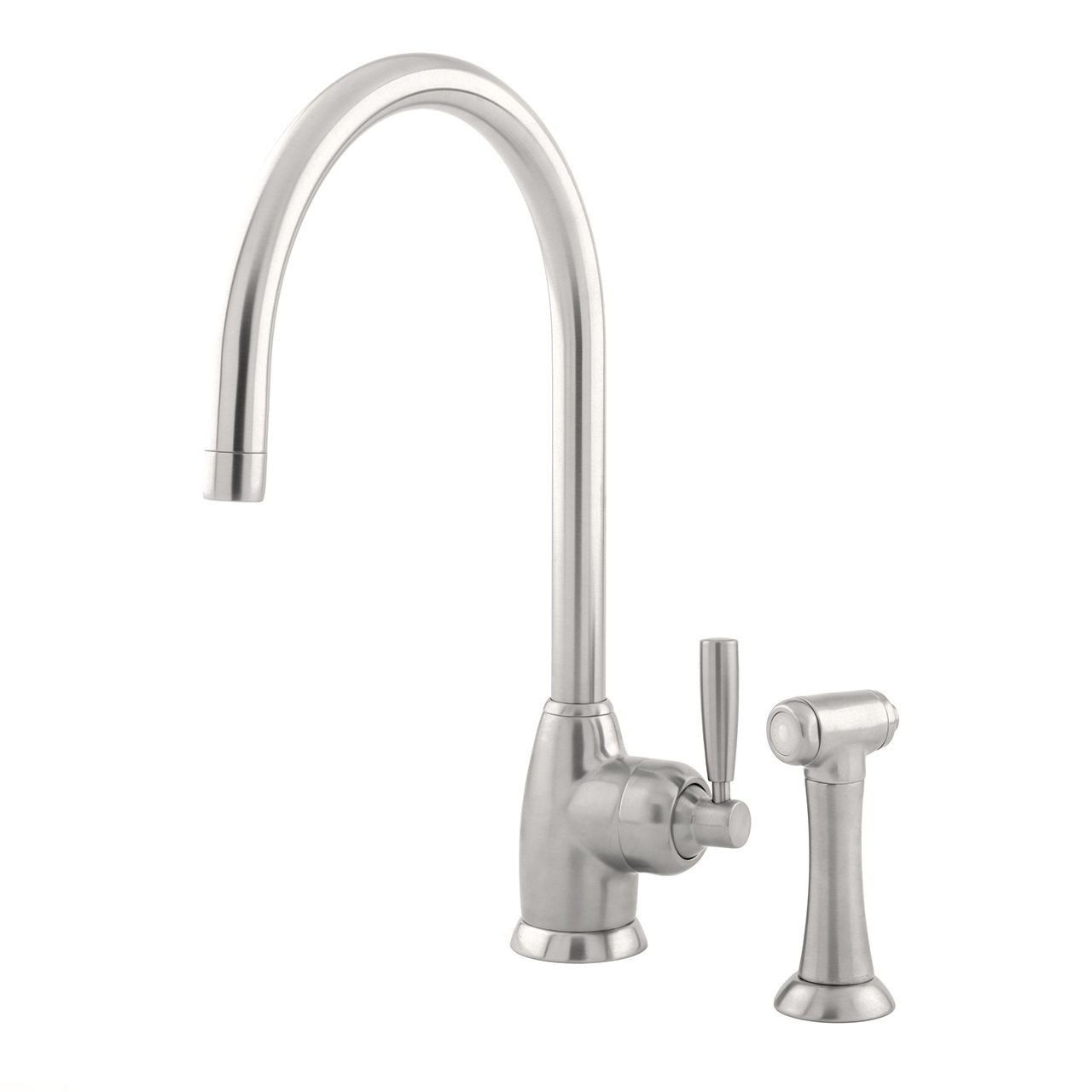 Kitchen monobloc sink mixer with single lever handle, C-spout, rinse, swivel spout and aerator.