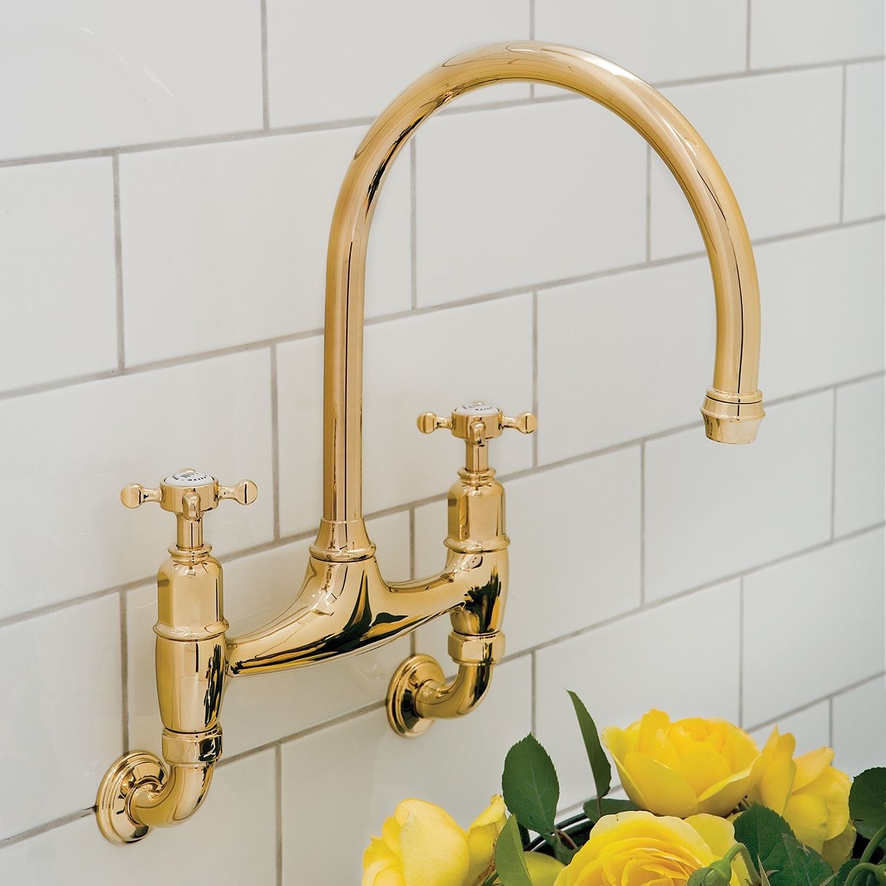 2-gats keukenbrugkraan wandmontage met kruisgrepen, zwenkbare uitloop en aerator voor gelijkmatige waterstroom.
